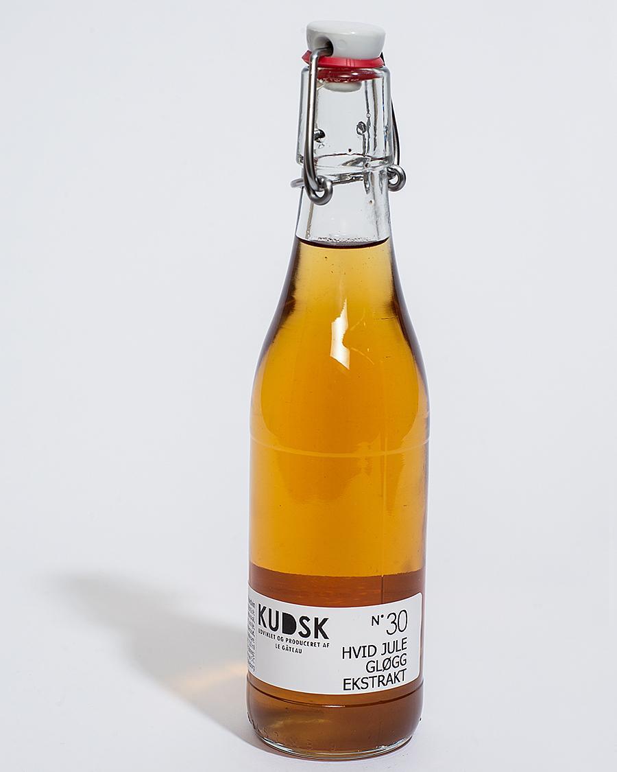 KUDSK hvid julegløgg ekstrakt fremstilles af sukker, glukose, appelsin og julekrydderier.